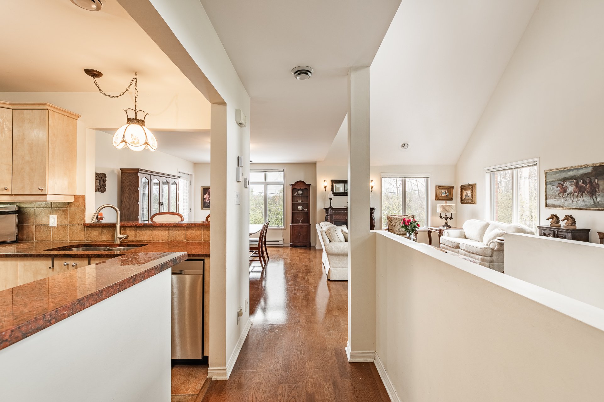 Condo lumineux et spacieux sur deux étages, unité de coin avec entrée privée extérieure et accès direct à un garage privé. Le rez-de-chaussée offre un espace à aire ouverte avec plafonds cathédrale, baigné de lumière naturelle. Comprend 2 chambres et 2 salles de bain complètes, dont une salle de bain attenante à la chambre principale. Une grande mezzanine offre un espace polyvalent pour bureau ou salle familiale. Profitez d'un accès direct au parc Centennial, avec sentiers, lac et espaces verts à votre porte.