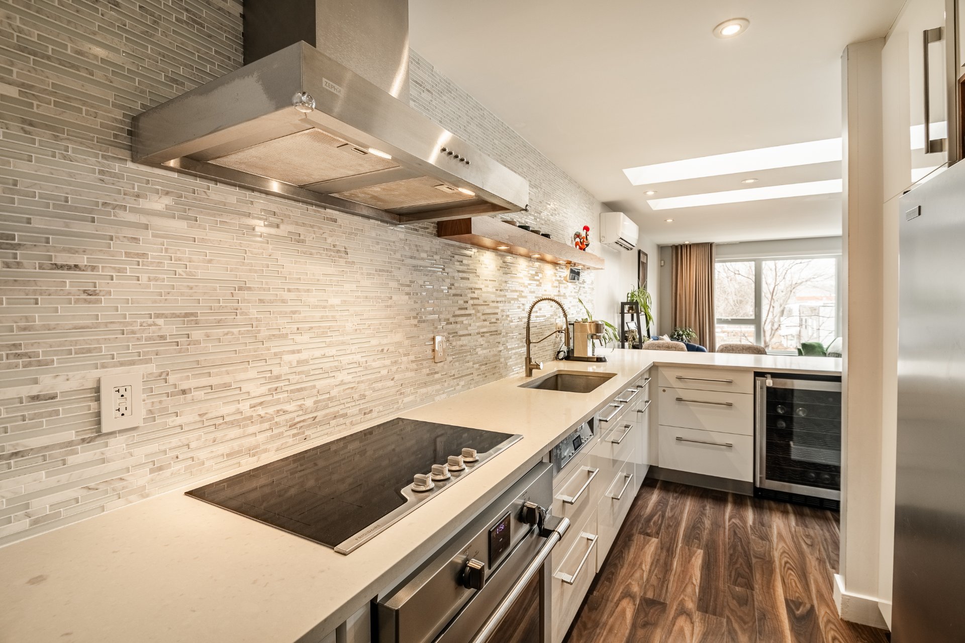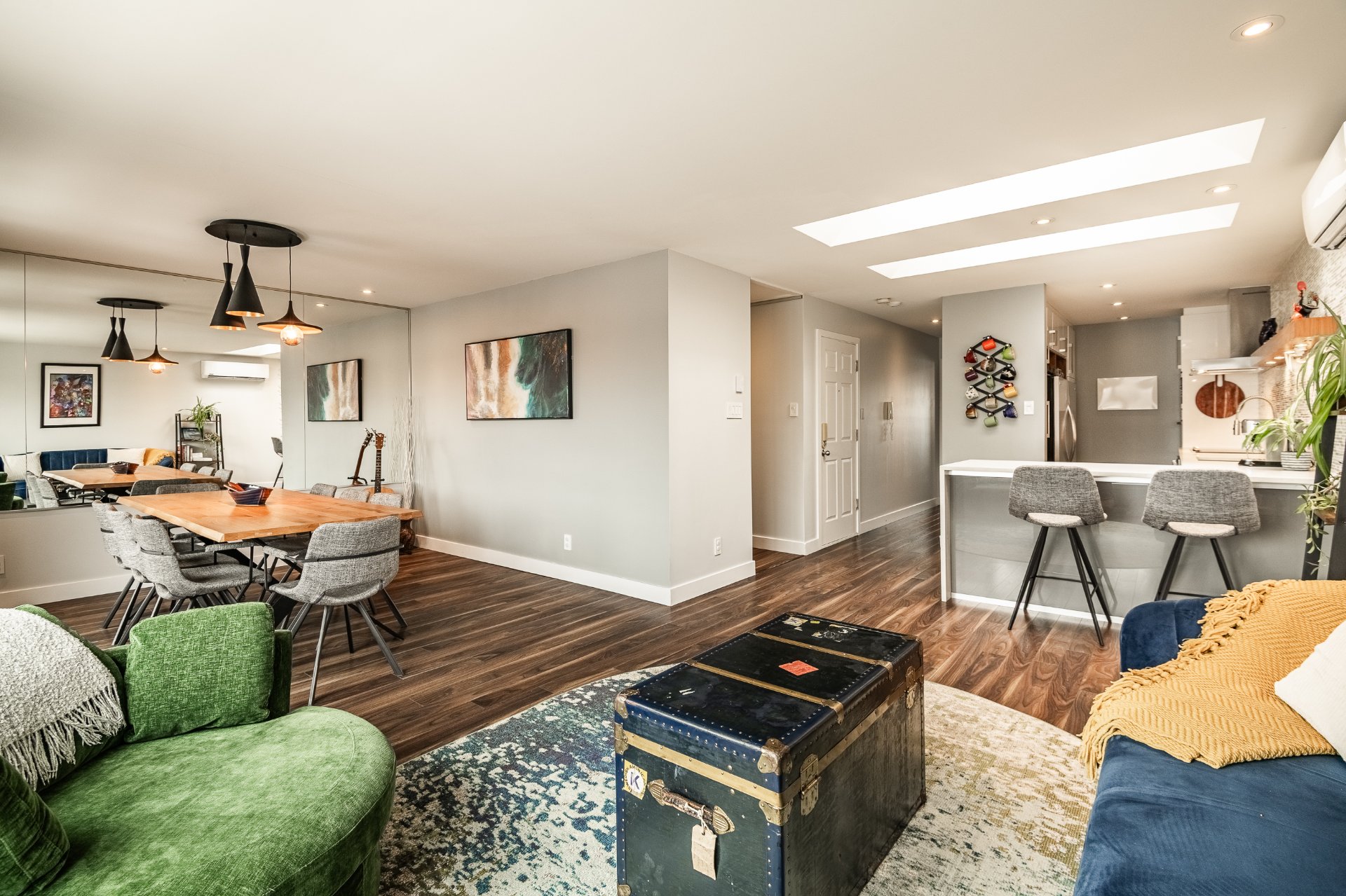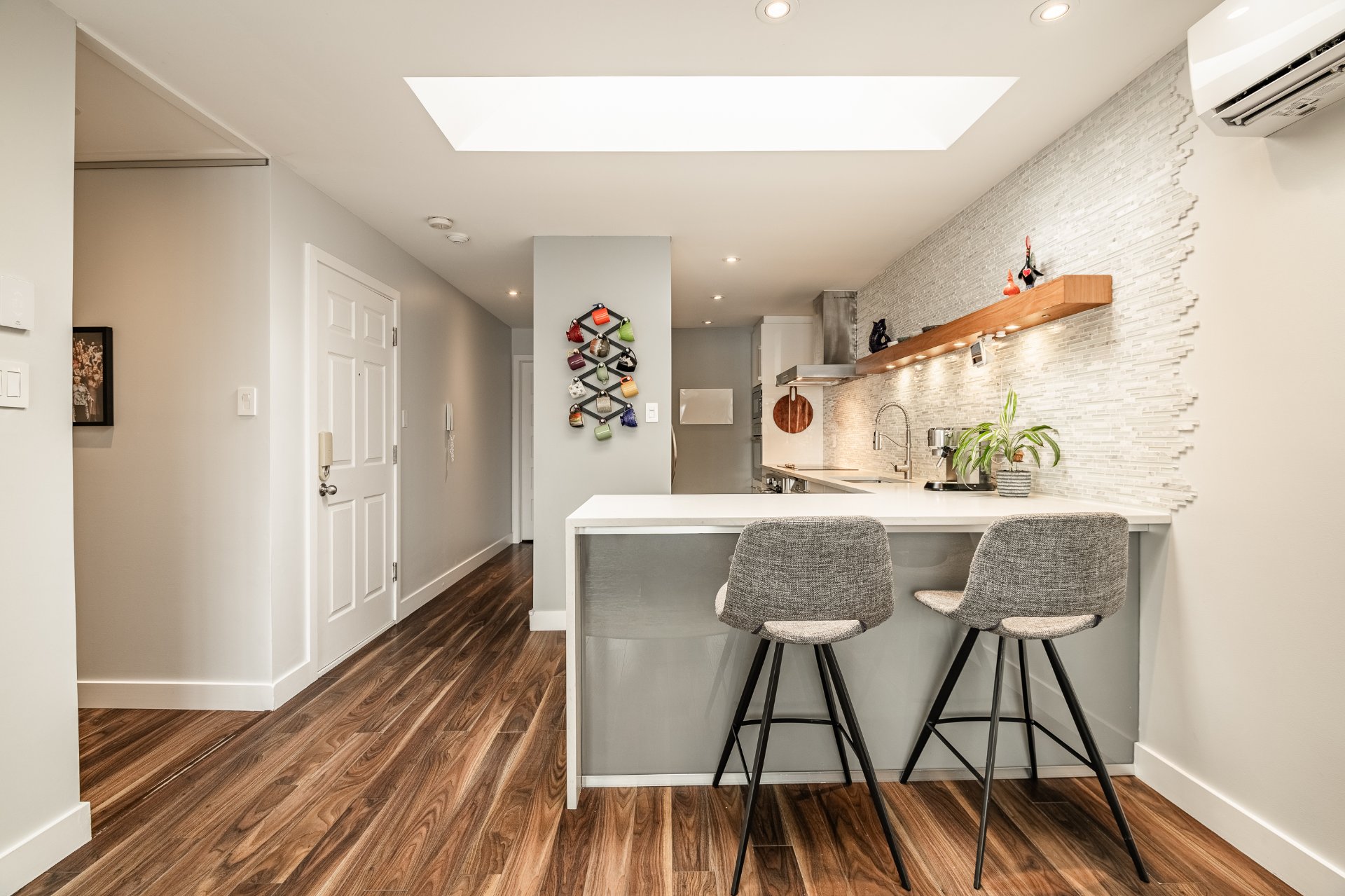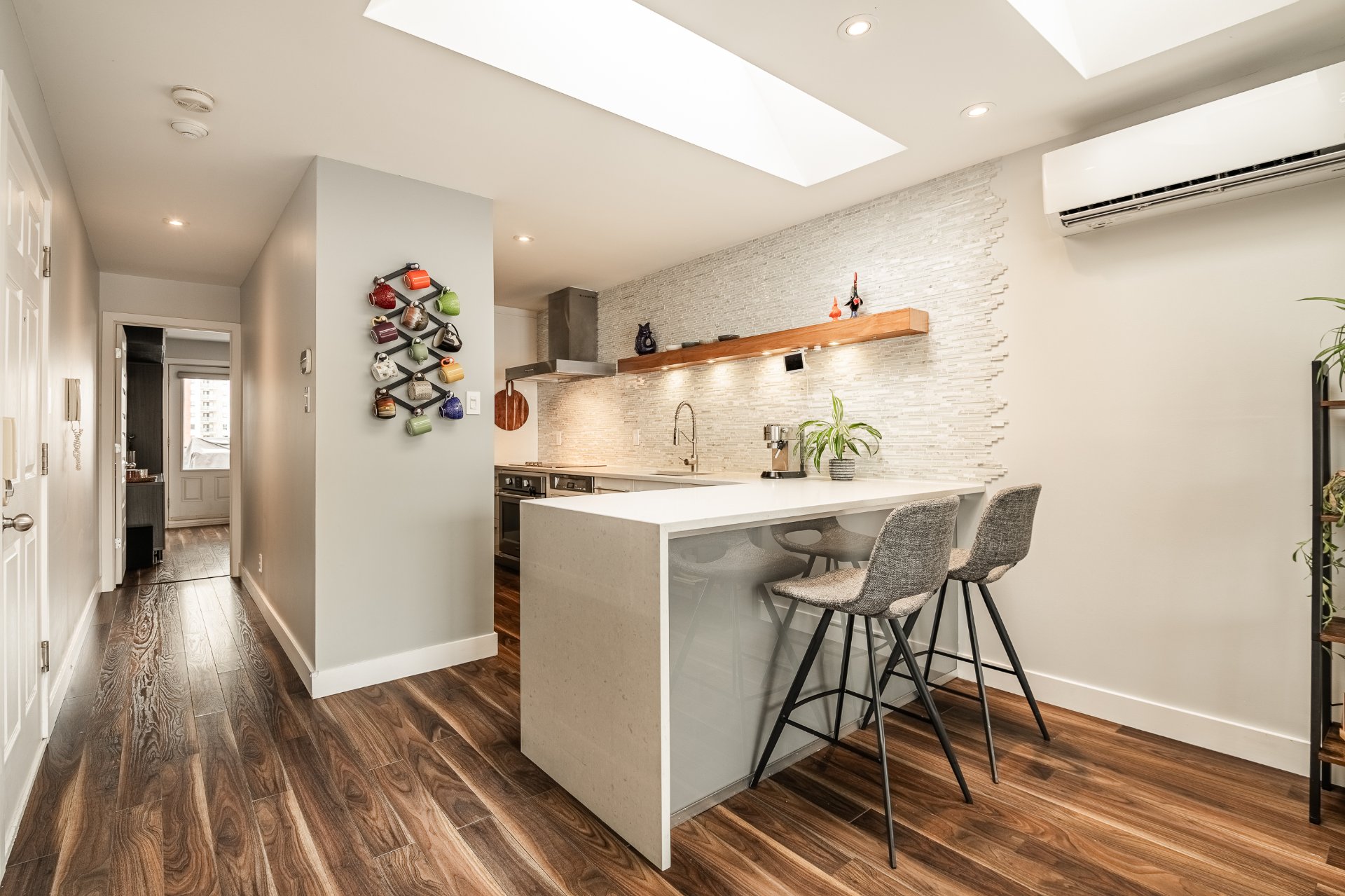 Exceptional Top Floor Condo in Pointe Saint Charles. This one of a kind condo in the highly sought after neighbourhood of PSC. This unit combines two condos to offer over 1400SqFt of living space. Featuring 4 bedrooms, 2.5 bathrooms,flooded with natural light, enhanced by skylights, showcasing a stunning kitchen that opens to the living and dining area. Very spacious balcony with ample storage, perfect for relaxing & entertaining. Condo includes 1 garage parking. Ideally located near parks, shops, schools, and all amenities in a great family friendly area. A truly unique condo.
